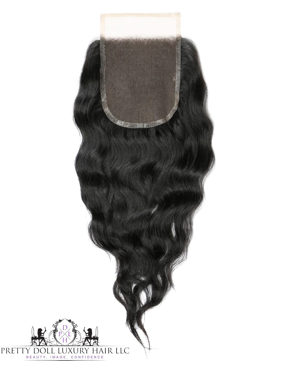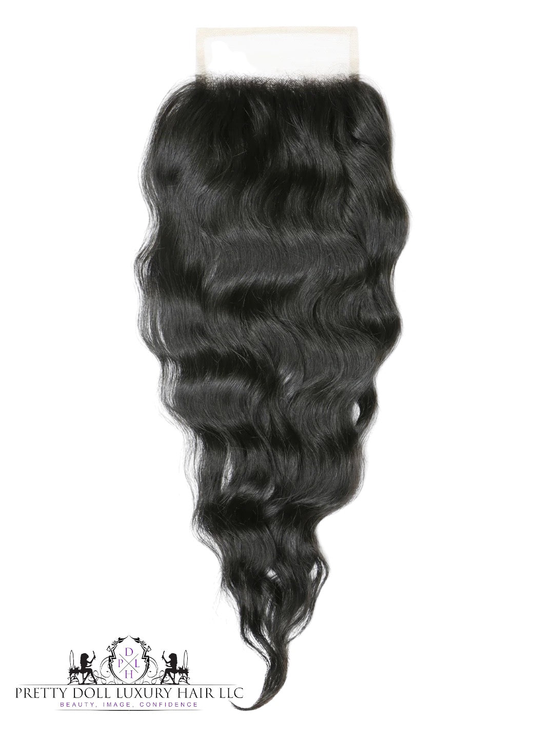 Medium to low luster. This closure have extremely small knots. It measures 5 inches by 5 inches and offers a high-definition (HD) finish which means a more realistic and natural appearance. This closure provides a seamless blend with the wearer's natural hair and helps create a fuller and more voluminous hairstyle.